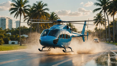 A blue helicopter takes off on a busy road in a tropical city, leaving behind a spray of water and dust