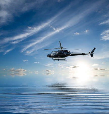 helicopter flying in the blue sky with white clouds and sea