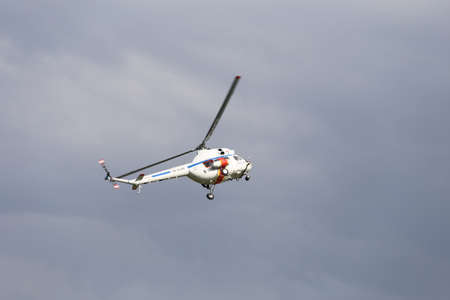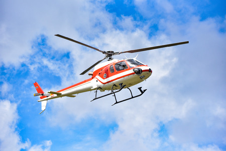 helicopter flying on sky / white red fly helicopter on blue sky with clouds good air bright day - helicopter rescue