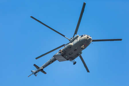 ZAGREB, CROATIA - AUGUST 4, 2015: Mi-171Sh Combat-Transport Helicopter flying during Zagreb military parade. It can carry three crew plus 36 troops, or 12 passengers on stretchers.