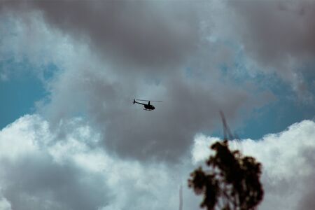 white helicopter flying in blue cloudy sky