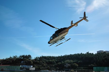 A helicopter with has multiple uses, here on this occasion it comes in to land to drop off or pick up it's passengers.