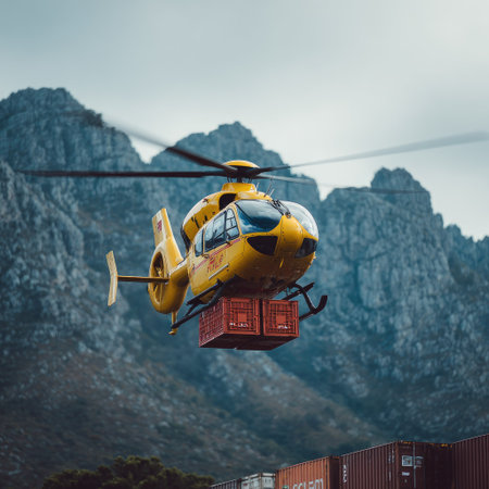 A yellow helicopter flies, carrying cargo containers. The image showcases a transport operation in a mountainous setting, under a cloudy sky. The composition emphasizes the contrast between the aircraft and the rugged terrain. Suitable for illustrating logistics, transportation, or business concepts, it can be used for various commercial projects.