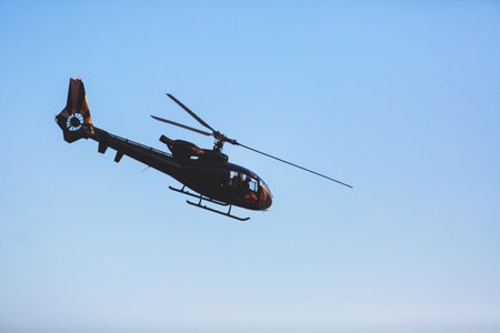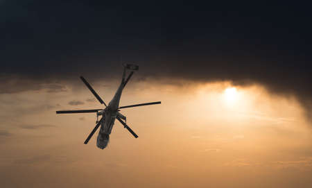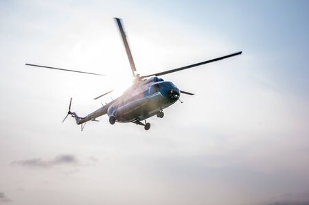Helicopter flying in the blue evening sky