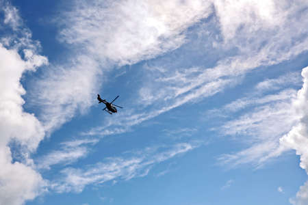 Passenger helicopter against the background of a blue sky with clouds.