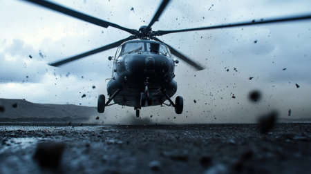 A helicopter is flying in the air with a lot of dirt and debris on it. The scene is dark and moody, with the helicopter being the main focus
