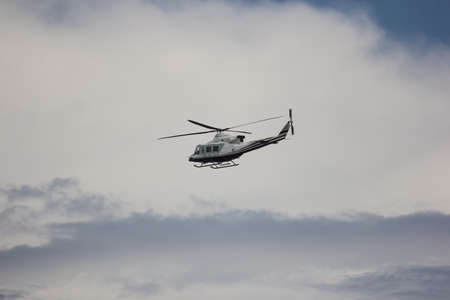 Sheriff Helicopter Hovering on a Beautiful Sky Background. Sheriff Department helicopter on a routine surveillance mission in Santa Monica. Los Angeles, California, USA. March 22nd, 2021