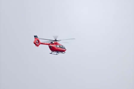 An Emergency red helicopter flying on the sky on a cloudy day.