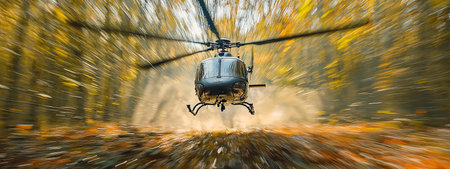 Close up view of helicopter rotors in action above forest clearing