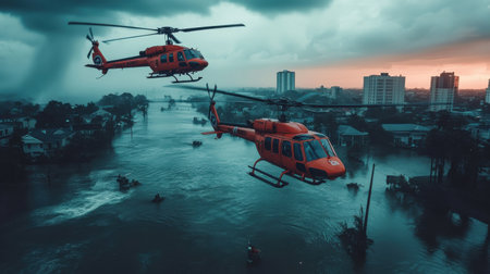 Coast Guard helicopters conduct dramatic rescues, reaching stranded individuals on rooftops amidst a flooded urban landscape during a hurricane.