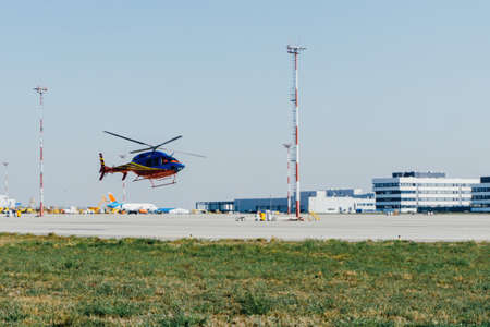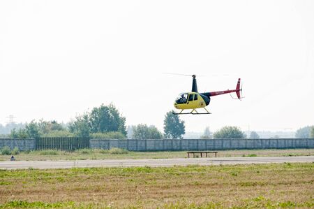 Rostov-on-Don, Platov Airport / Russia - 04 October 2019: A small private helicopter landing at the airport Platov during the official spotting
