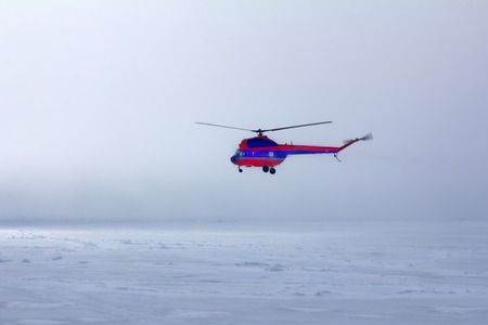 Near the North pole. Ship's helicopter in fog at Arctic ocean (pack ice), air transport in bad weather conditions (utility aviation, leisure aviation)