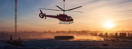 A helicopter hovers gracefully over rugged mountain terrain, illuminated by the soft light of a sunrise.