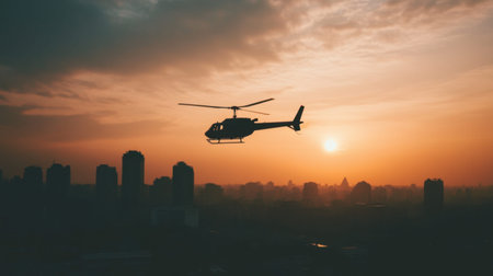 A helicopter soars gracefully over a city skyline at sunset, showcasing a dramatic interplay of light and shadow amidst a serene urban backdrop.