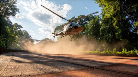 A helicopter lifts off from the ground, kicking up dust in a vibrant natural landscape, with sunlight streaming through the trees.