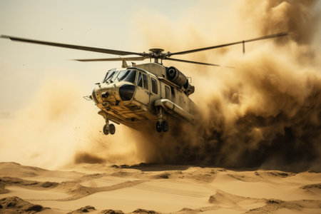 Helicopter lifts off during sunset, creating a dramatic scene with dust and light, emphasizing military aviation technology and operational capabilities in action