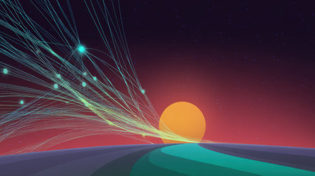 This stunning digital artwork captures a vibrant sunset with bright abstract lines flowing from the sun, creating a mesmerizing visual of motion and tranquility in a twilight landscape.