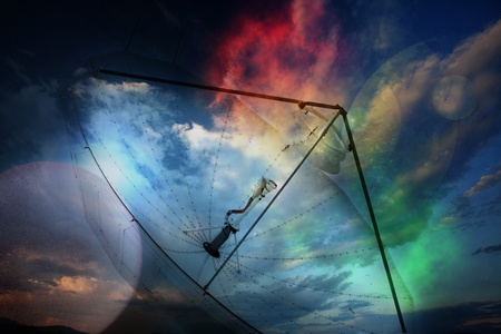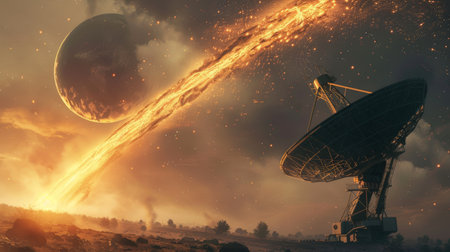 A space scene with a satellite and a planet. The satellite is a large antenna that is pointing towards the sky. The scene is filled with stars and a bright orange streak that looks like a comet