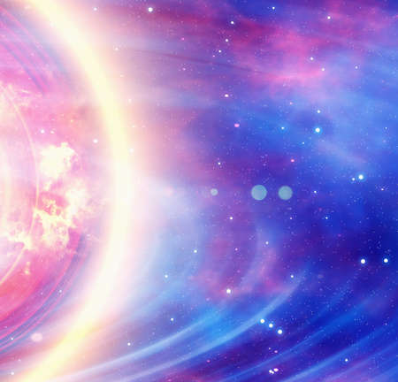 Abstract space background with a glowing star and the colorful arc of a planet. A beam of light adds a futuristic and mysterious element to the cosmic scene.