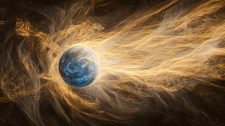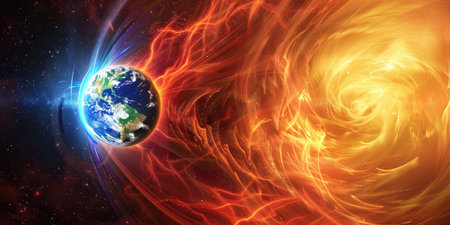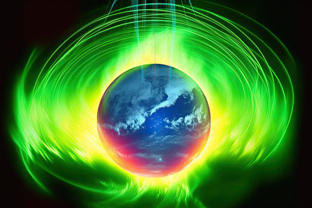 A stunning display of a magnetic storm envelops Earth, featuring brilliant colors streaming from the sun's surface, interacting with the planet's magnetic field in real-time.