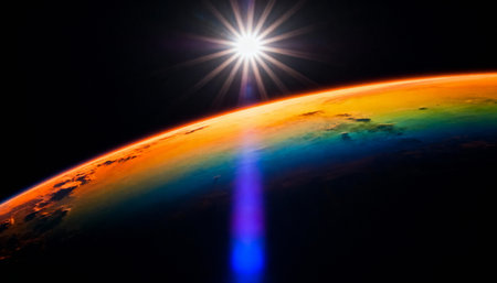 In the glowing embrace of a distant sun, warm light spills over the horizon, casting an ethereal glow on the vast cosmic landscape, evoking wonder and awe.
