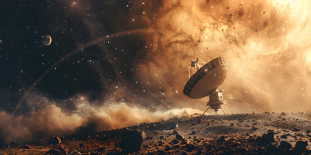 Exploration on Mars with astronaut navigating base amidst swirling dust storm and satellite. Concept Space Exploration, Mars Mission, Astronaut, Dust Storm, Satellite