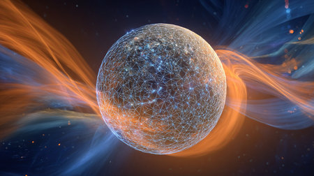 Glowing sphere with intricate mesh structures is surrounded by swirling blue and orange light, creating dynamic and futuristic atmosphere