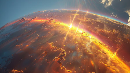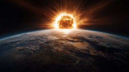 AI Generated. Dramatic sunrise or sunset seen over Earth from outer space