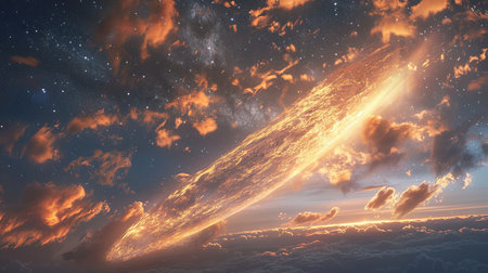 A bright, fiery comet streaks across the sky, illuminating a night sky full of stars and clouds.