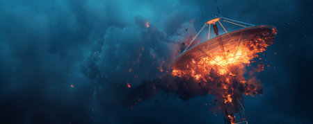 A burning radar system with bright flames and dense smoke, isolated on a deep blue background, emphasizing the dramatic effect.