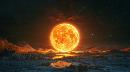 A brilliant red glow envelops the moon, illuminating its surface under a cosmic backdrop filled with distant planets and stars.
