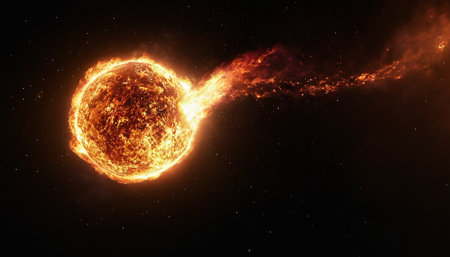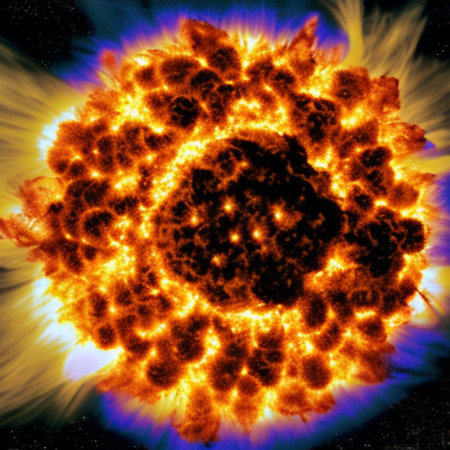A dramatic depiction of an explosive solar eruption with a meteor shower, showcasing vibrant colors and cosmic elements in deep space. Ideal for sci-fi themes.