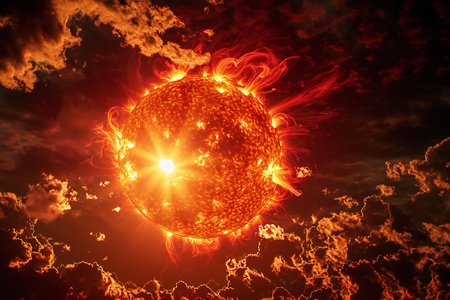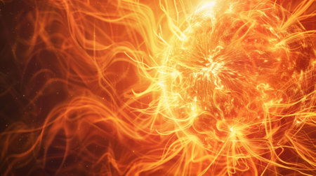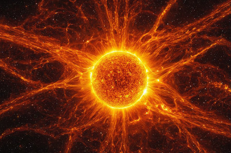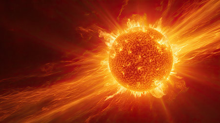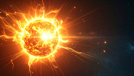 Blazing sun emitting powerful rays of light, cosmic and high-energy scene.