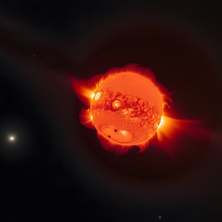 An image showcases a radiant celestial body amidst a dark backdrop, with vibrant red and orange hues dominating the scene. Energetic lines of light emanate outwards. The overall composition suggests a dynamic and expansive environment. This could be used for scientific illustrations, educational materials, or artistic representations of space.