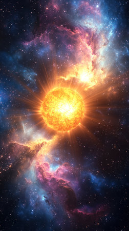 Golden sun bursts with energy surrounded by vibrant cosmic clouds in deep space