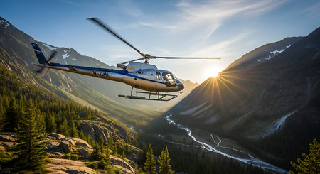 A helicopter soars above a forested valley towards snow-capped mountains in the golden hour