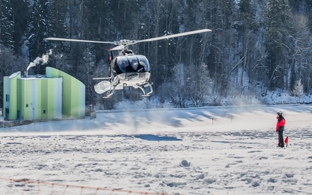 Chateau de Oex, Switzerland, 26th January 2013. A helicopter landing at a snow field at the 35th International Hot Air Balloon festival. It is being held from 26th January to 3rd February 2013.