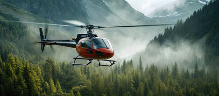 Rescuers landed by helicopter to search for people lost in the foggy forest generative ai.