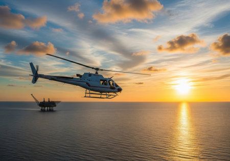 A helicopter flies over the ocean near an oil rig during a vibrant sunset, isolated on a white background.