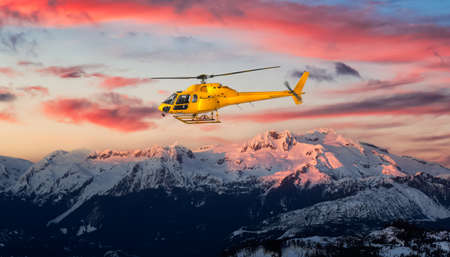 Yellow Helicopter flying over the Rocky Mountains. Dramatic Sunrise. Aerial Landscape from British Columbia, Canada near Squamish and Vancouver. Composite. Canadian Panoramic Nature Background