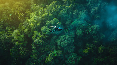 medical helicopter flies over dense jungle, transporting wounded soldier to safety, created with generative ai
