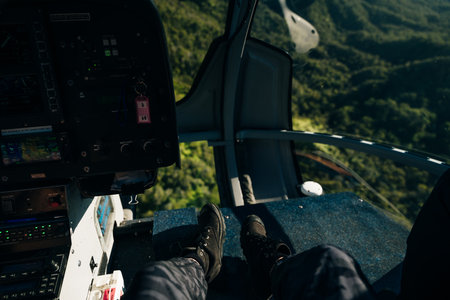 Capturing a breathtaking view from a helicopter cockpit, flying over a dense forest at sunset, with the expert pilotly navigating the landscape