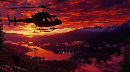 A helicopter soars through a vibrant sunset sky over a majestic mountain range, casting a silhouette against warm colors, evoking feelings of adventure and tranquility.
