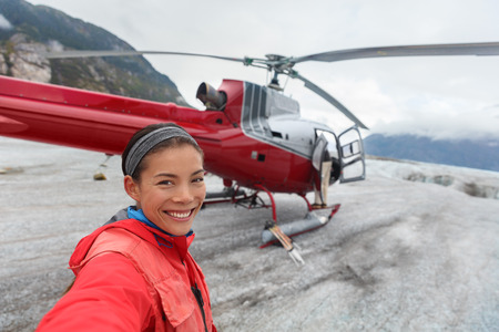 Happy tourist taking selfie picture on helicopter tour excursion. Asian woman cruise passenger on shore activity glacier walk hike in Alaska, USA.