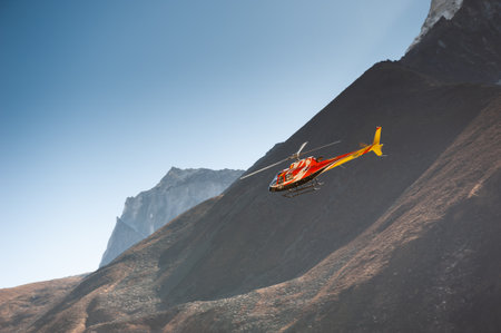 Helicopter in Himalaya mountains, Nepal.. Khumbu valley, Everest region, Nepal. Autumn landscape