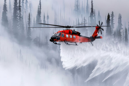 Helicopter hovers above smoke covered forest, releasing water in effort to extinguish wildfire threatening vegetation and wildlife. Firefighting team works diligently to contain blaze.