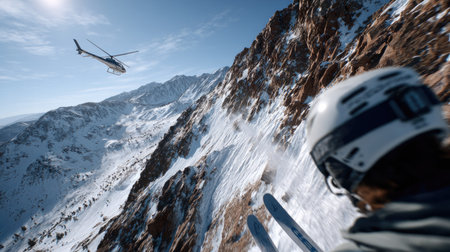 Experience an exhilarating day of skiing in breathtaking snowy mountains as a helicopter soars above, showcasing a pristine winter landscape and adventure spirit.