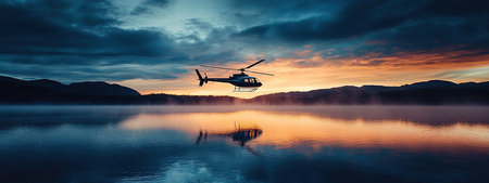 Helicopter hovers over tranquil lake at dusk surrounded by mountains