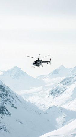 Helicopter is flying over snowy mountain peaks, providing a fast and efficient mode of transportation for business executives in remote and challenging environments