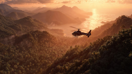 Helicopter flying over lush tropical mountain landscape at golden sunset with dramatic coastal scenery and ocean views creating cinematic aerial perspective.